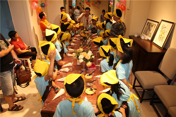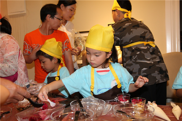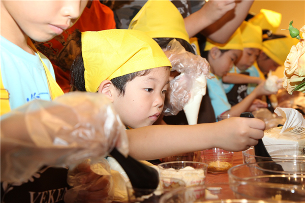 鋪上薄薄的一層餅干碎,擠上一層厚厚的奶油,再鋪上一層餅干碎,再擠上一層奶油……看似簡單的操作,著實讓小朋友們手忙腳亂了一番,這倒是樂壞了旁邊本就蠢蠢欲動的家長們,紛紛上手親自操刀原本就不大的場地顯得更加熱鬧擁擠。