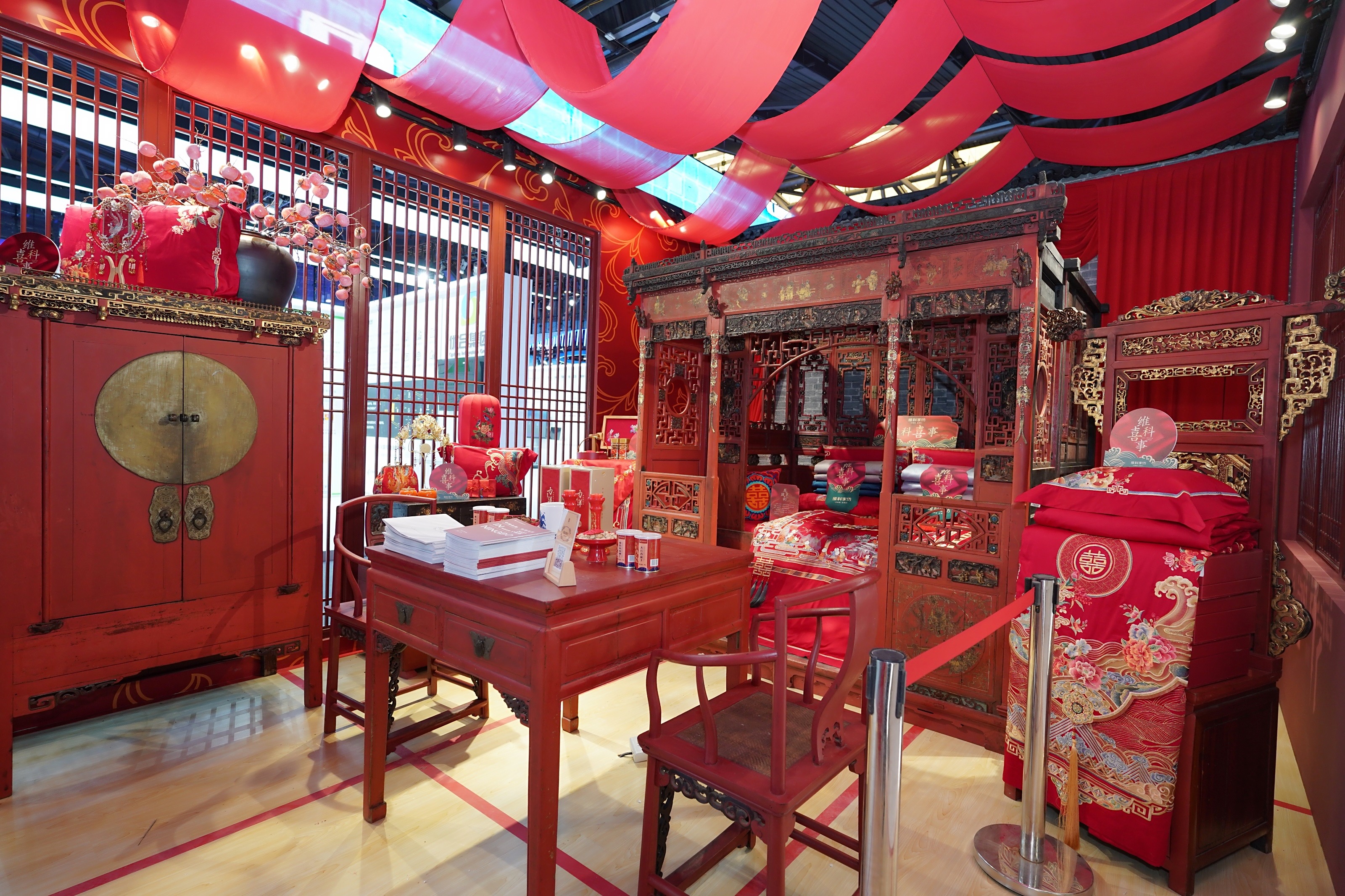 寧波發(fā)改委的相關(guān)負(fù)責(zé)人表示,由維科家紡精心打造的古代婚房是本次寧波館展廳的一大亮點。通過重工刺繡的婚慶套件【百子百?!俊君堈馒P彩】【錦繡年華】、華美的鳳冠喜扇等展品,結(jié)合收藏夾協(xié)會提供的長達(dá)兩百年歷史的古董家具,展現(xiàn)了濃厚的婚慶氛圍和傳統(tǒng)文化的精髓,將“十里紅妝”的獨特魅力展現(xiàn)得淋漓盡致。